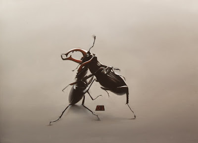 Leach’s work is undeniably beautiful, but does that mean people miss the darker conceptual elements at play in the work? This could be particularly true of this artist’s pictures as they are such tiny, darkly lacquered objects that you have to look very carefully to see the contemporary allegorical twist in the subject matter – the soulless, airless corporate interiors the animals inhabit – what the artist has called “spiritual vacuums”. Moreover, the beauty of the works can blind the viewer to the fact that the beautifully crafted animals are actually dead – most likely the result of human intervention.