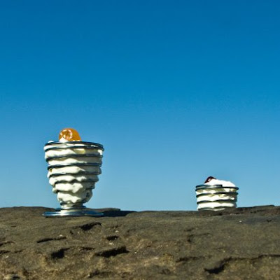 Still life in landscape – Forbidden Fruit counterpoints the traditional elegance of still life photography (placing cloved fruit, toffee apples and cherries) with vibrant landscapes of earth, sky and water.