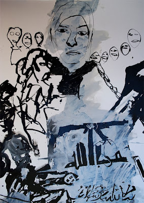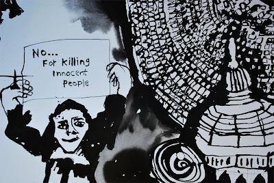 LJ: Yes, that’s correct. Funny because the title for my 30 metre work is “Making sense of senselessness”, and you have just asked me this question about trying to make sense of cultural events as I go along. I tend to work straight off the bat so yes, I am responding in an immediate way to the images on the television, Internet, magazines or journals that I use as inspiration, kind of like a Mass Media Regurgitator and when an image excites or angers me or I feel quite strongly about a certain war or innocent lives lost then I will respond with a lot more aggression and violence than what I would if I were merely rendering in ink a politician or lunar space module, and a lot of my feelings and personal stuff get caught up in the process and this makes for a jumble of images and text which might appear confusing but I feel all the better for laying it out. At least it might help when people look at the work, and are reminded of the horrors of Gaza, Mumbai, Somalia, Congo, Rwanda, Zimbabwe before they are assaulted by the next wave of media hysteria.