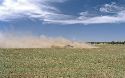 Bender’s past work has ventured along this line of inquiry, with his sequence of images of Belanglo Forest , and while Bender made a better fist of the idea by including small details in his large photos such as small memorial crosses, there was the persistent problem of disappearance. It’s all very well highlighting the interpretative process, but you wonder how this is any different to most pictures. One almost has sympathy for the misguided opinions of people like Christopher Allen who, in his recent review of the Andreas Gursky show for The Australian, made the claim that the further that photography gets away from “truth” [by which he probably means reportage] the less valuable it is. Nah. What we want is for the photographer’s work to be seen to be telling us something, and hopefully to do it with a degree of subtlety. For Bender’s show there are just two big images, one is of a car doing circle work in a field, while on the other wall there’s a giant time lapse photograph of stars leaving circular light trails. The dialogue between these images is simplicity itself, but a fractal kind of simplicity where the micro is reflected in the macro. That it should come in the context of something so quotidian makes it all the more delightful.