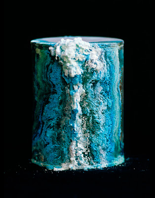 “. . . these canisters hold the cremated remains of patients from an American psychiatric hospital. Oddly reminiscent of bullet casings, the canisters are literal gravesites. Reacting with their ash inhabitants, the canisters are now blooming with secondary minerals, articulating new metallic landscapes.”