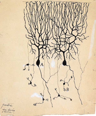 “Nineteenth-century histologists created some of the first images of nerve cells by chemically stiffening tissue and then immersing it in silver nitrate, randomly staining a small number of cells to make them visible when they were viewed with powerful new light microscopes. The technique revealed the silhouette of the cell body and its network of extensions, and it enabled the great neuroanatomist Santiago Ramón y Cajal to prove that the nervous system consists of cells. He produced the 1899 drawing at left: it shows finely branched Purkinje cells, large neurons in the cerebellum that play an important role in controlling movement…”