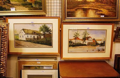 The two paintings entitled “Farmstead” (left) and “Farm Buildings On The River” by Adolf Hitler.