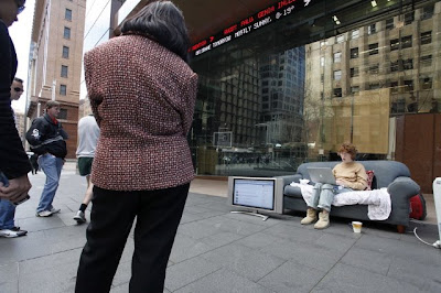 “As a public experiment, artist Julia Burns (alias: ‘rose_burns’) decided to blog on twitter in full view of the lunchtime crowd in Martin Place, Sydney, for one hour. She sat on her living room couch, wearing ugg boots and a comfy sweater, next to her heater, favourite cup, and a box of chocolate mints as she posted tweets about her life in front of the Channel 7 building.